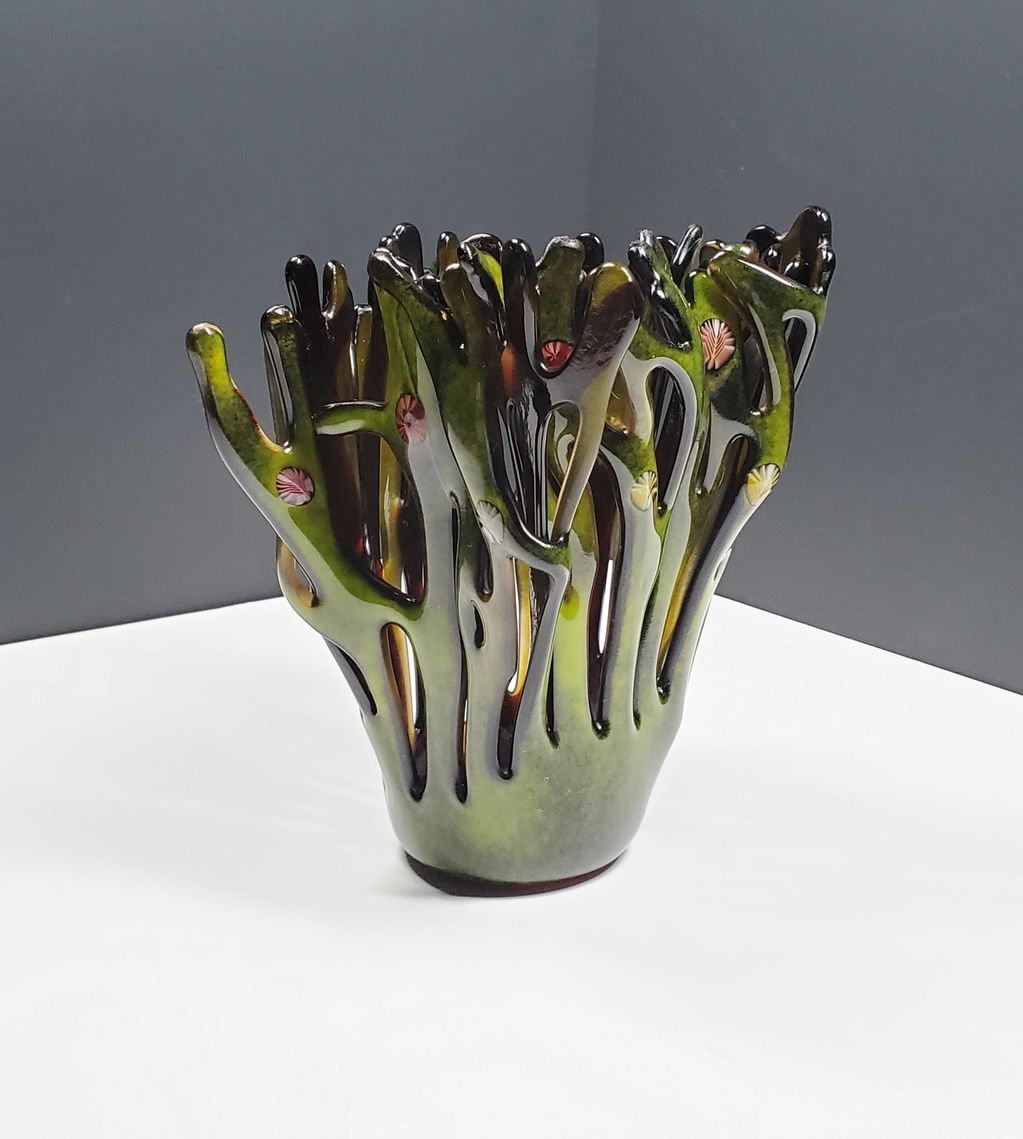 Design includes Hand Pulled Murrine and Drop Technique. Murrine created in my studio. Weighs approximately 1.85 lbs, 6" tall, 7"wide at top.