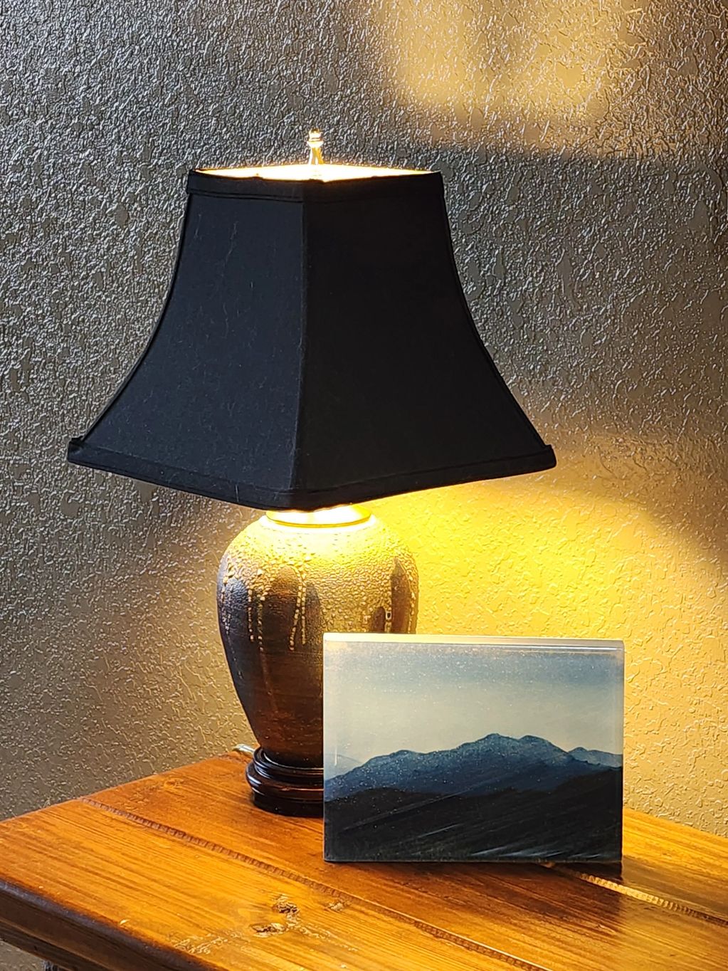 1" thick, weighing 3.7 lbs, 6"x8". Uses special techniques of enameling and depth of field by layering.
