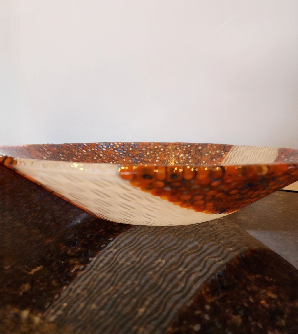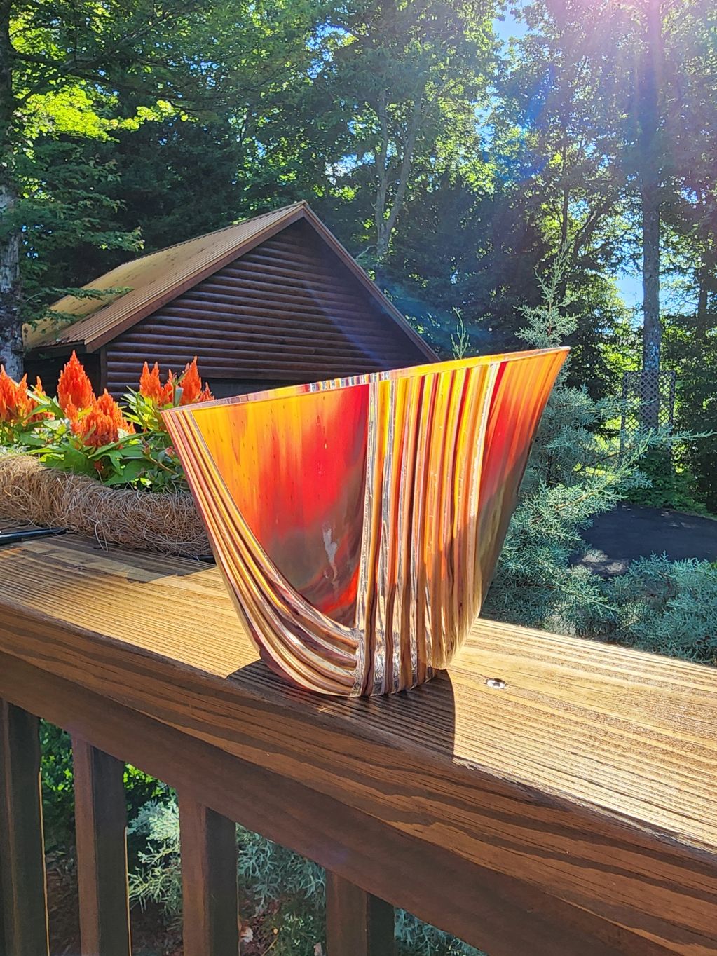Drop Vessel, approximately 6" tall, 7" wide at mouth and 4" at base. Amazing streaky glass and strip method.